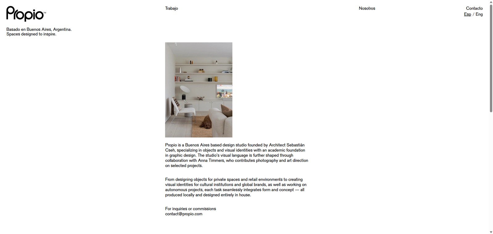 Propio es un estudio de diseño con sede en Buenos Aires, fundado por el arquitecto Sebastián Cseh. Se especializa en la creación de objetos e identidades visuales con base académica en diseño gráfico. En colaboración con Anna Timmers, desarrolla proyectos donde forma y concepto se integran con una producción local cuidada.